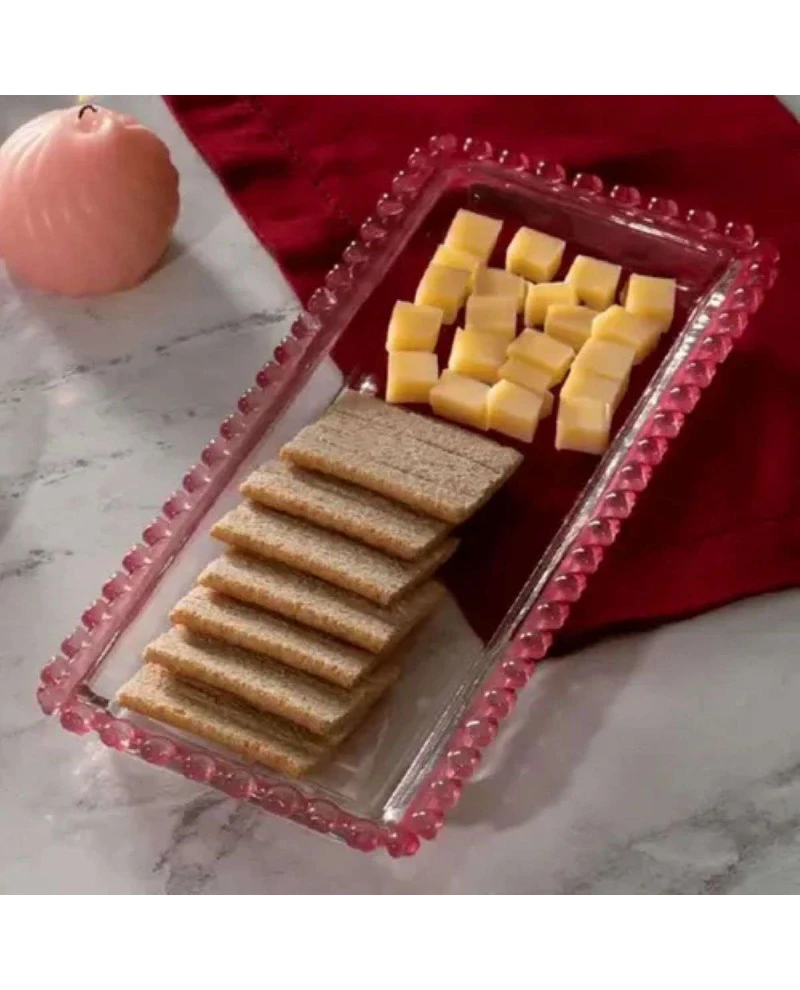 Travessa Retangular de Cristal com Borda Rosa de Coração