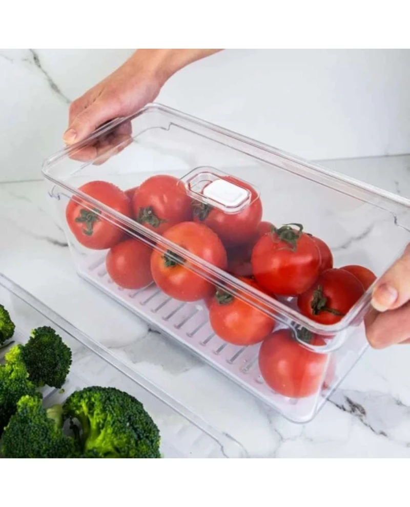 Organizador De Geladeira Com Tampa Clear Fresh é o novo padrão de transparência na organização da sua geladeira. Empilhe, encaixe e enxergue facilmente os alimentos armazenados na geladeira, mantendo tudo em ordem. Seu design foi pensado para promover frescor prolongado aos alimentos, mantendo uma rotina sem desperdícios. Produzido em material resistente o organizar possui alças confortáveis que facilitam na hora do transporte.