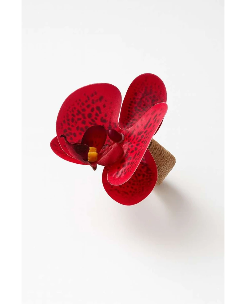 Orquídea decorativa em tom vermelho vibrante, perfeita para compor porta-guardanapos, arranjos e detalhes de mesa posta. Sua aparência realista e acabamento delicado trazem elegância e destaque à decoração.