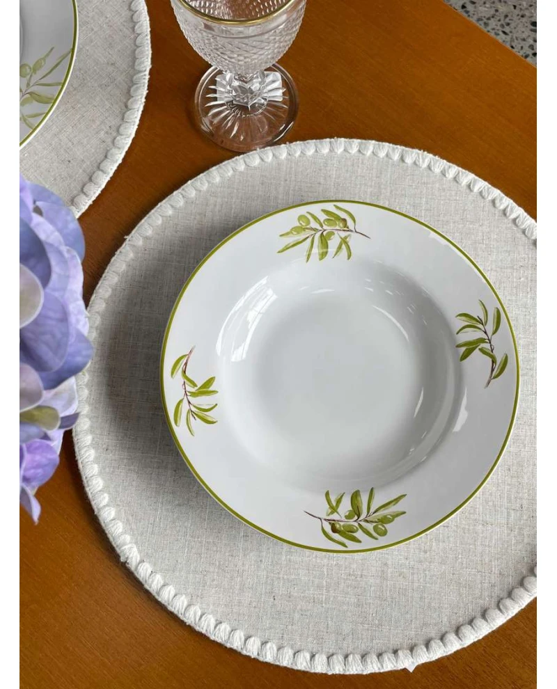 Cor: Branco com Ramos de Folhas de Oliveiras e Azeitonas Pintadas em Aquarela Decoram a Aba do Prato.