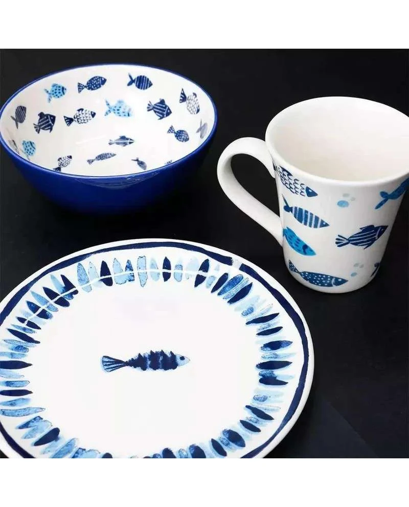 O conjunto é ideal para café da manhã e lanches, incluindo um prato de sobremesa, bowl e caneca. A decoração marinha com peixes em aquarela torna-o perfeito para diversas ocasiões.