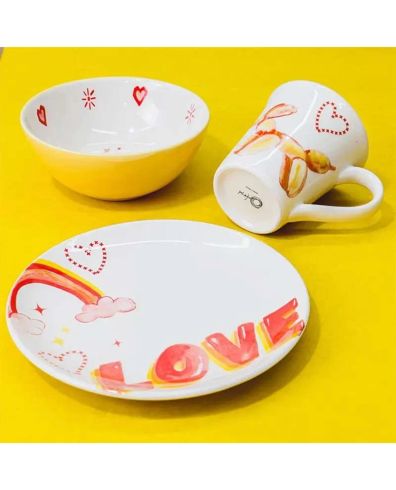 O conjunto lanche é o set ideal para refeições rápidas. O conjunto lanche é o set ideal para refeições rápidas. Composto por um prato de sobremesa, um bowl e caneca o trio de peças é perfeito para o café da manhã, lanches e até para o serviço de caldos e sopas no inverno. A era Pop continua em alta, e seus elementos divertidos e tons pastéis foram os escolhidos para estampar o conjunto Pop. O tom de amarelo manteiga, tendência na moda, faz parte dos desenhos feitos em aquarela e decora o interior da caneca e o bowl.