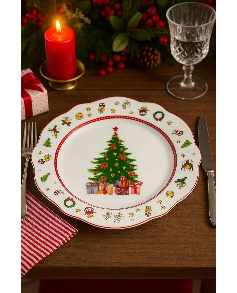 Transforme suas celebrações de fim de ano com este elegante prato de sobremesa natalino! Decorado com uma vibrante árvore de Natal no centro, este prato traz um toque festivo e sofisticado para suas mesas de festa.