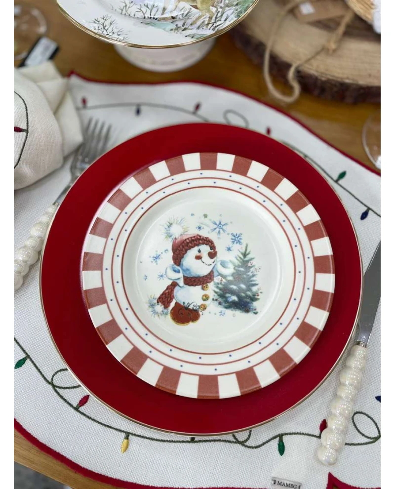 Encante sua mesa de natal com este prato de sobremesa, traz uma charmosa estampa natalina com borda listrada em vermelho, perfeita para compor uma mesa elegante e festiva.