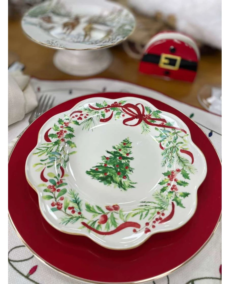 Prato de Cerâmica natalino com estampa exclusiva da Árvore de Natal ao centro e bordas decoradas com laços vermelhos, azevinhos e folhagens festivas. Ideal para compor mesas de ceia trazendo o espírito natalino para suas celebrações. Acabamento delicado com bordas onduladas e detalhes dourados.