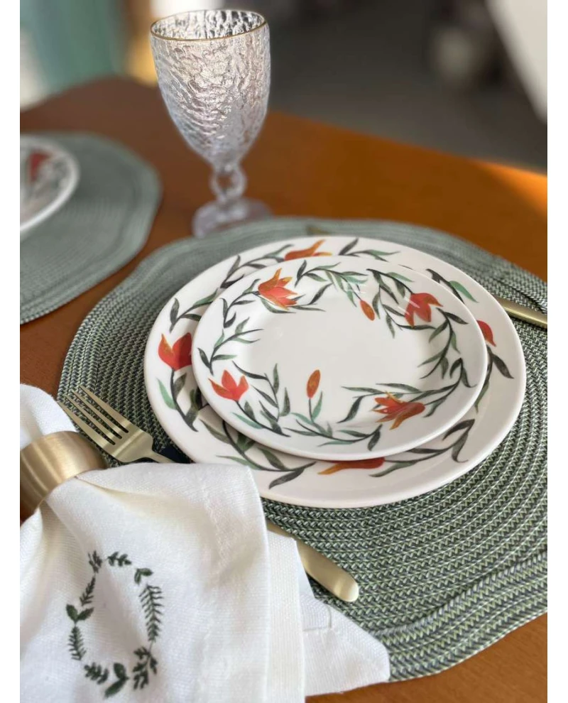 Os lírios são uma das flores mais comuns em jardins e casas brasileiras. Na coleção Donna Lírios, ele vira a estrela principal da decoração. As bordas de cada borda e pires recebem o desenho feito à mão da flor de cor laranja junto de ramos e folhas. As cores são vibrantes e trazem alegria à mesa. O prato sobremesa é vendido individualmente nessa opção.