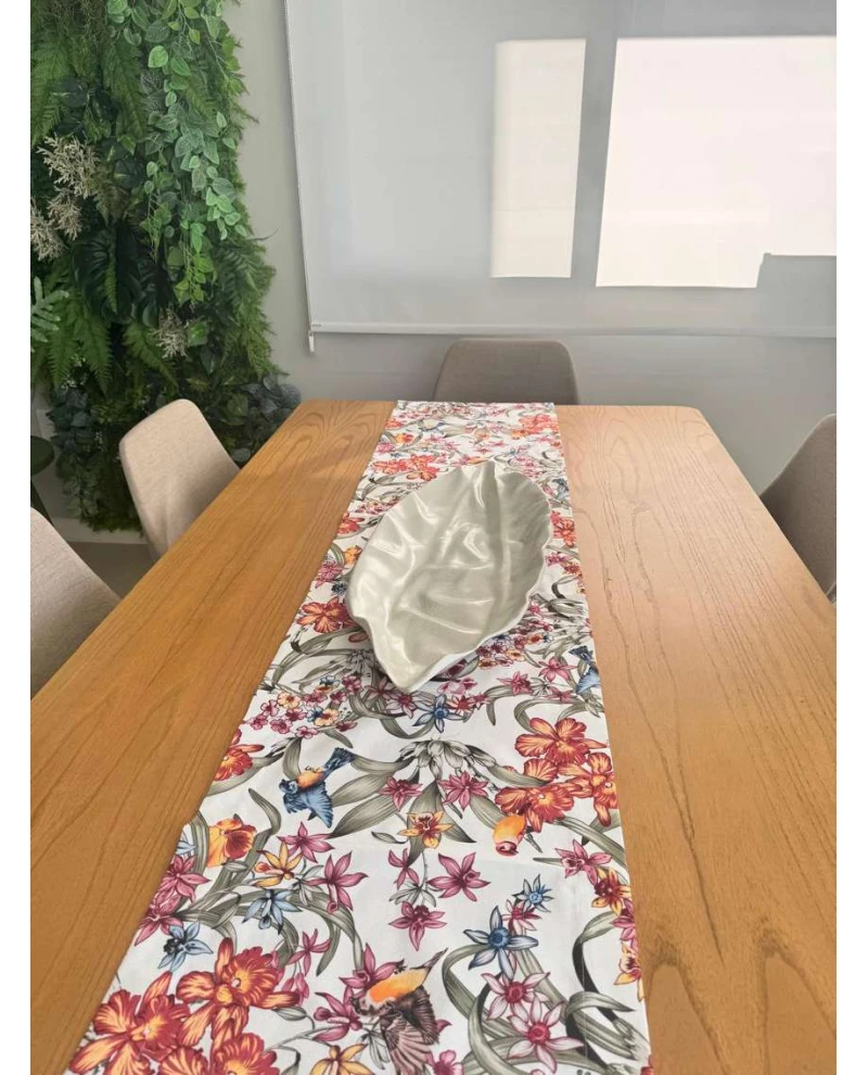 Trilho em tecido estampado com toque de linho .