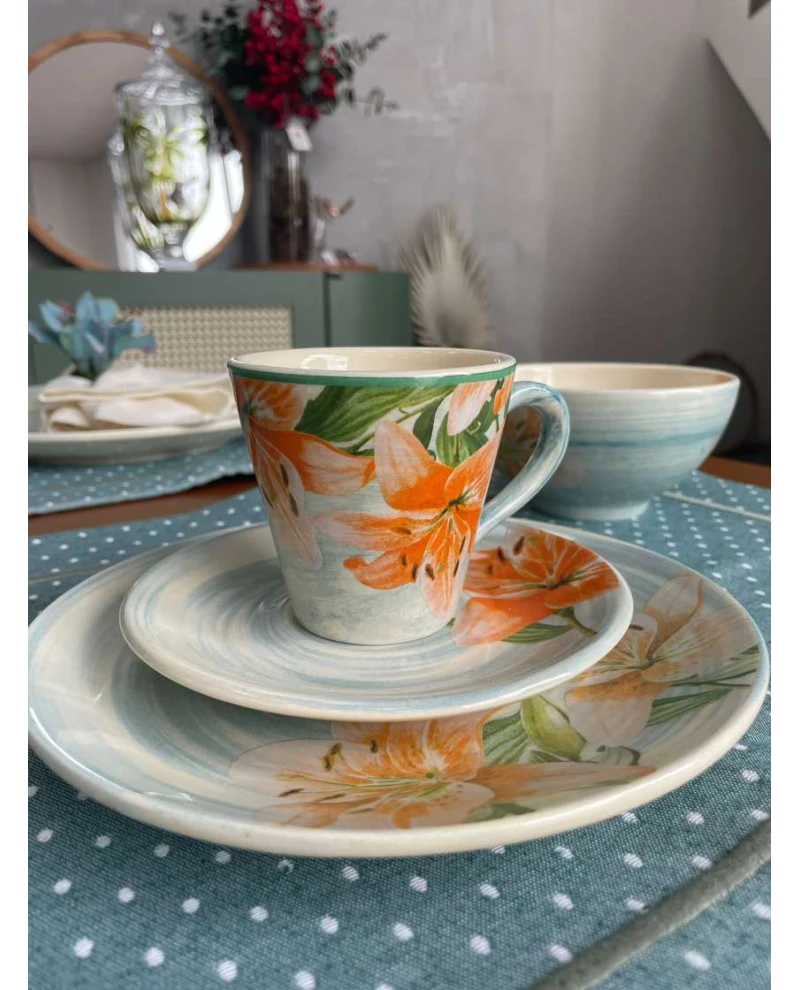 A Xícara de Chá com Pires Lily Flower Scalla encanta pelo seu design floral delicado e colorido, trazendo leveza e alegria à sua mesa posta. Produzida em cerâmica de alta qualidade, une beleza e funcionalidade, sendo perfeita para momentos especiais. Seu acabamento com estampas de flores em tons vibrantes torna cada peça única e cheia de charme.